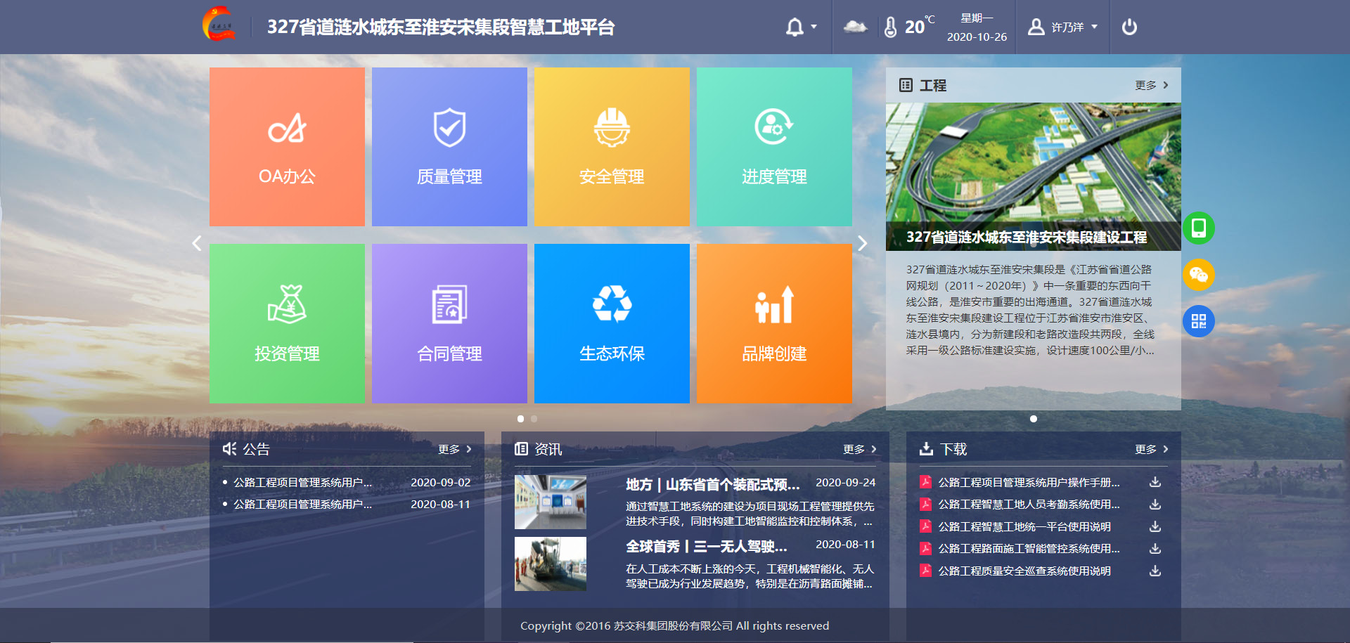 近日,集团自主研发的智慧工地平台在327省道涟水城东至淮安宋集段建设工程中成功应用并稳定运行,有效提升了项目施工精细化管理水平,为品质工程创建提供技术支撑。 智慧工地平台搭建基于项目实际情况及管理需求,遵循“统筹规划、分阶段实施”原则,共设置OA办公、质量管理、安全管理、进度管理、投资管理、合同管理、生态环...