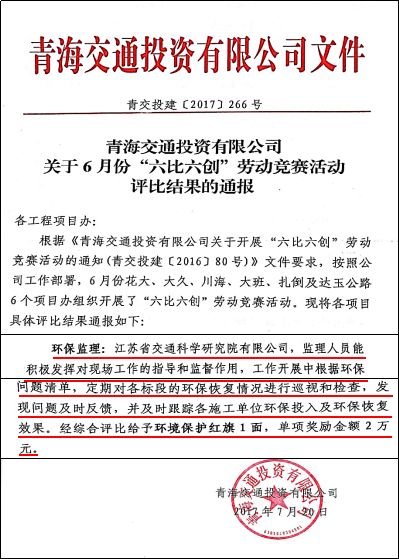 日前,fun88集团环境所环境管理技术服务小组在青海省大武至久治公路(以下简称“大久公路”)建设项目“六比六创”活动评比中获业主表彰,被授予环境保护红旗。“六比六创”是青海交通投资有限公司围绕工程质量、安全生产、环境保护、工程进度、综合管理、科技创新这六个方面举办的评比活动,设立流动红、黄旗,严格兑现奖惩,是项目办对参建单位在各项目工作中综合评价...