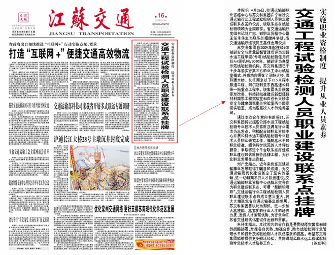 【媒体报道】实施职业资格制度 提升从业人员素养——交通工程试验检测人员职业建设联系点挂牌(《江苏交通报》于2016年4月27日第一版刊载)