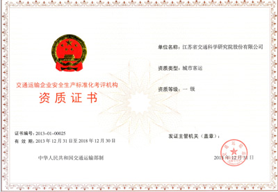 2013年12月31日,我公司被交通运输部认定为交通运输企业安全生产标准化考评机构,资质等级一级,专业类型为城市客运,证书有效期自2013年12月31日起至2018年12月30日。  企业安全生产标准化代表了现代安全管理的发展方向,能有效提高企业安全生产水平。开展交通运输企业安全生产标准化考评是交通运输行业贯彻落实《国务院关于进一步加强企业安全...
