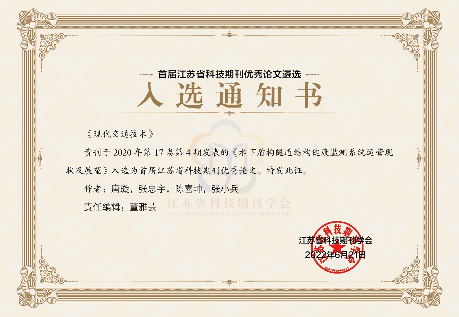 2022年7月5日,首届江苏省科技期刊优秀论文颁奖典礼暨“第五届院士主编汇智论坛”在南京举行。《现代交通技术》2020年第17卷第4期发表的由唐璇、张忠宇、陈喜坤、张小兵撰写,董雅芸编辑的《水下盾构隧道结构健康监测系统运营现状及展望》入选首届江苏省科技期刊优秀论文。本次活动由江苏省科技期刊学会主办,江苏省科学技术协会领导、...