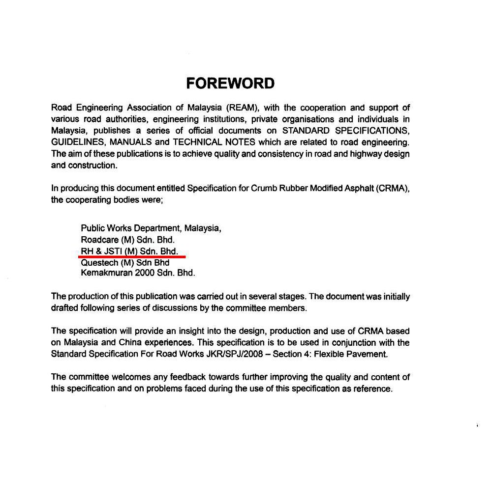 近日,由fun88集团主编的马来西亚国家规范《胶粉改性沥青》(REAM-SP7/2018)正式发布。fun88集团首席工程师曹荣吉带领相关部门技术团队主导了整个规范的编制,联合马来西亚国家工程部、政府公共交通办公室、国家养护公司、国家咨询公司及Kemakmuran工程公司,历时九个月,结合当地道路建设与养护的特点,制定出适用于马来西亚的《胶粉改性沥青》国家规范。