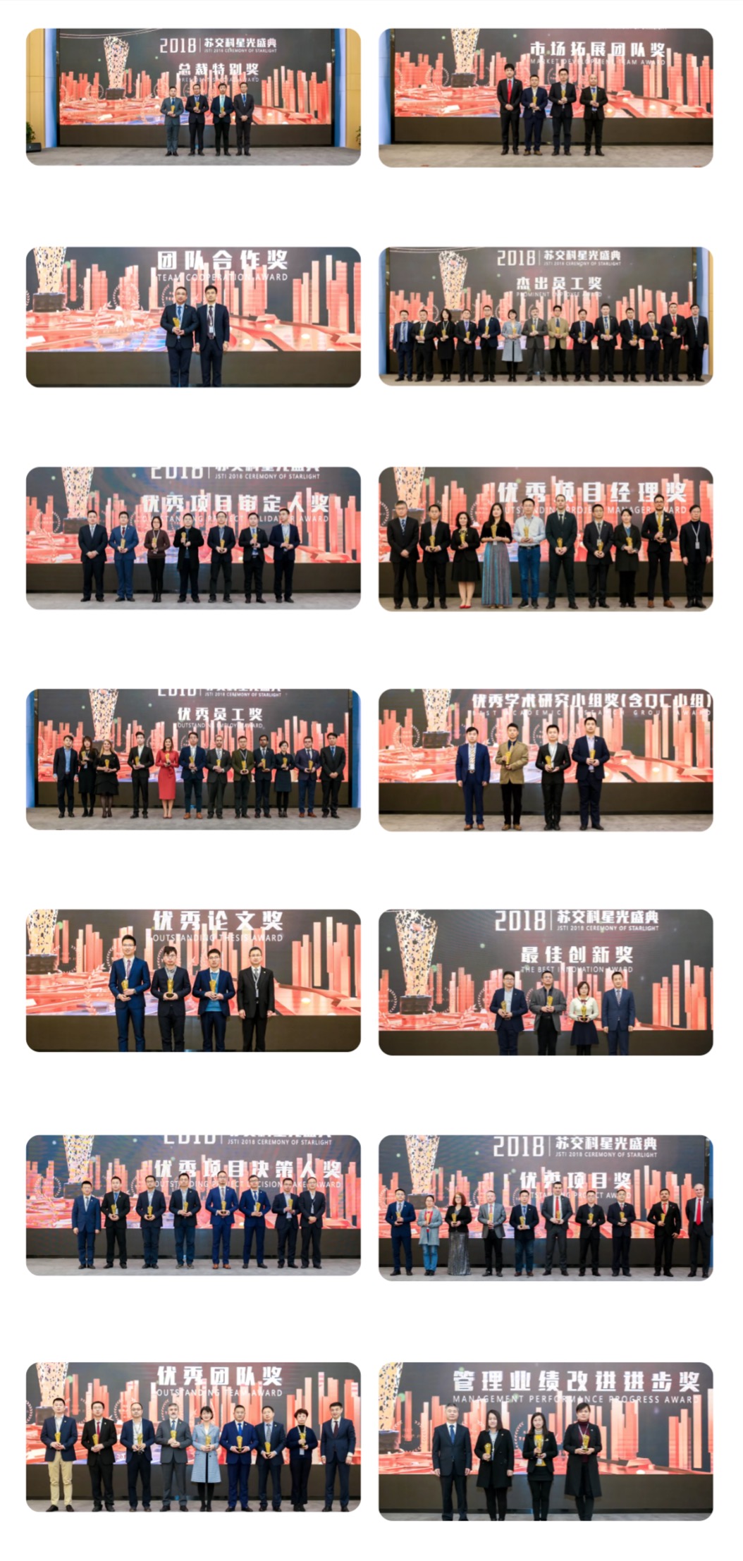 会议还表彰了2018年度集团在管理创新、学术科研、项目管理、市场拓展、团队合作等各方面涌现出来的一批优秀团队和个人。现场颁发了“最佳创新奖、管理业绩改进进步奖、优秀论文奖、优秀学术研究小组奖(含QC小组)、优秀员工奖、优秀项目经理奖、优秀项目审定人奖、优秀项目决策人奖、优秀项目奖、杰出员工奖、团队合作奖、市场拓展团队奖、优秀团队奖、总裁特别奖”等14项大奖。