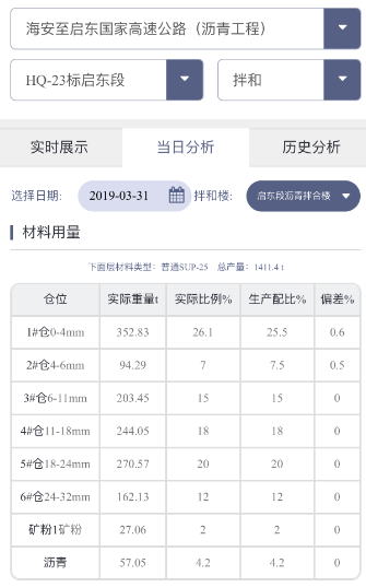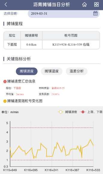 海启高速水稳基层施工及沥青路面施工均采用智能管控信息化系统,对拌和楼各个料仓的波动、油石比波动、矿粉波动、运输车辆摊铺桩号位置溯源,实时监控摊铺机温度速度、压路机温度速度及碾压轨迹遍数。现场人员可通过手机APP进行实时监控,及时了解现场施工状况,现场技术服务人员每日分析智能管控系统数据,并及时反馈给业主,保证整体施工质量可控。