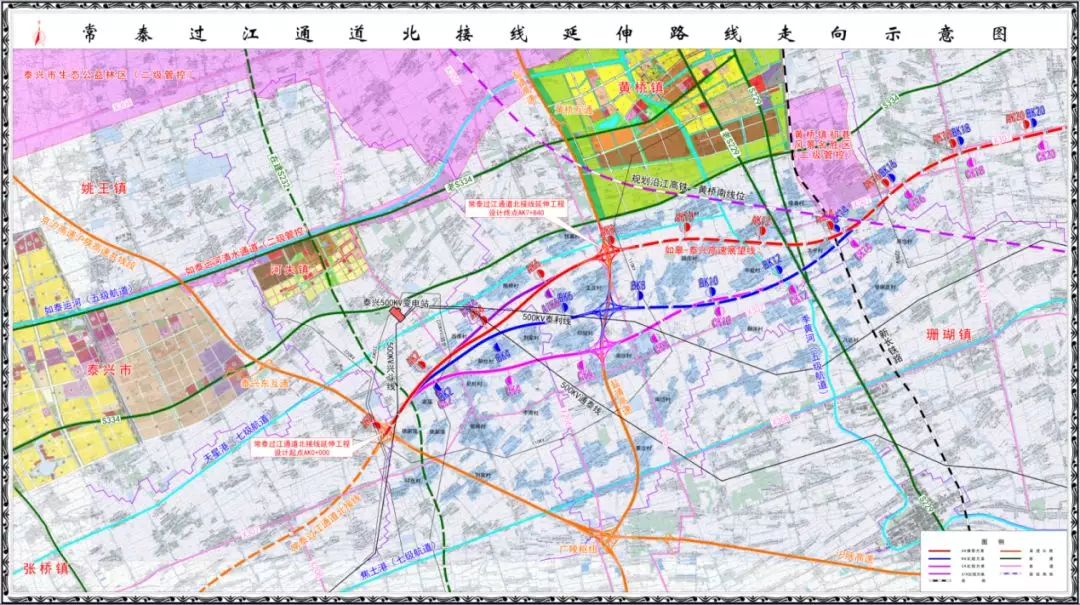 拟建的如皋至常州高速公路黄桥至泰兴段(常泰过江通道北接线延伸)工程在泰兴境内,是《江苏省高速公路网规划(2017―2035年)》中的新增高速公路,是江苏省“十五射六纵十横”新一轮高速公路网中如皋-常州高速公路的重要组成部分,编号为S30。项目向西南直连规划常泰过江通道北接线,沿线串联京沪(沪陕)高速公路和盐靖高速公路两大高速公路,位于泰兴市境内,属扬子江城市群区域。一方面与常泰过江通道共同构建连接常州泰州两市的高速通道,加强江淮生态经济区、沿海经济带城市结点与扬子江城市群之间的联系,实现快速互联互通;另一方面加强京沪(沪陕)高速公路、盐靖高速公路几大高速公路的快速转换功能。项目起自黄桥镇南,与盐靖高速公路交叉处,向西南延伸,止于沪陕高速公路泰兴东枢纽,与常泰过江通道北接线顺接,路线全长约8公里。