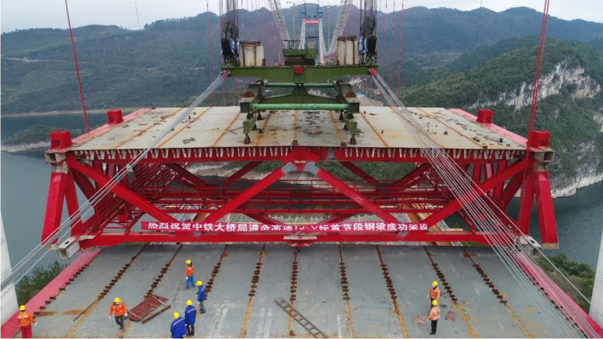 ▼ 飞龙湖乌江大桥首片钢桁梁架设