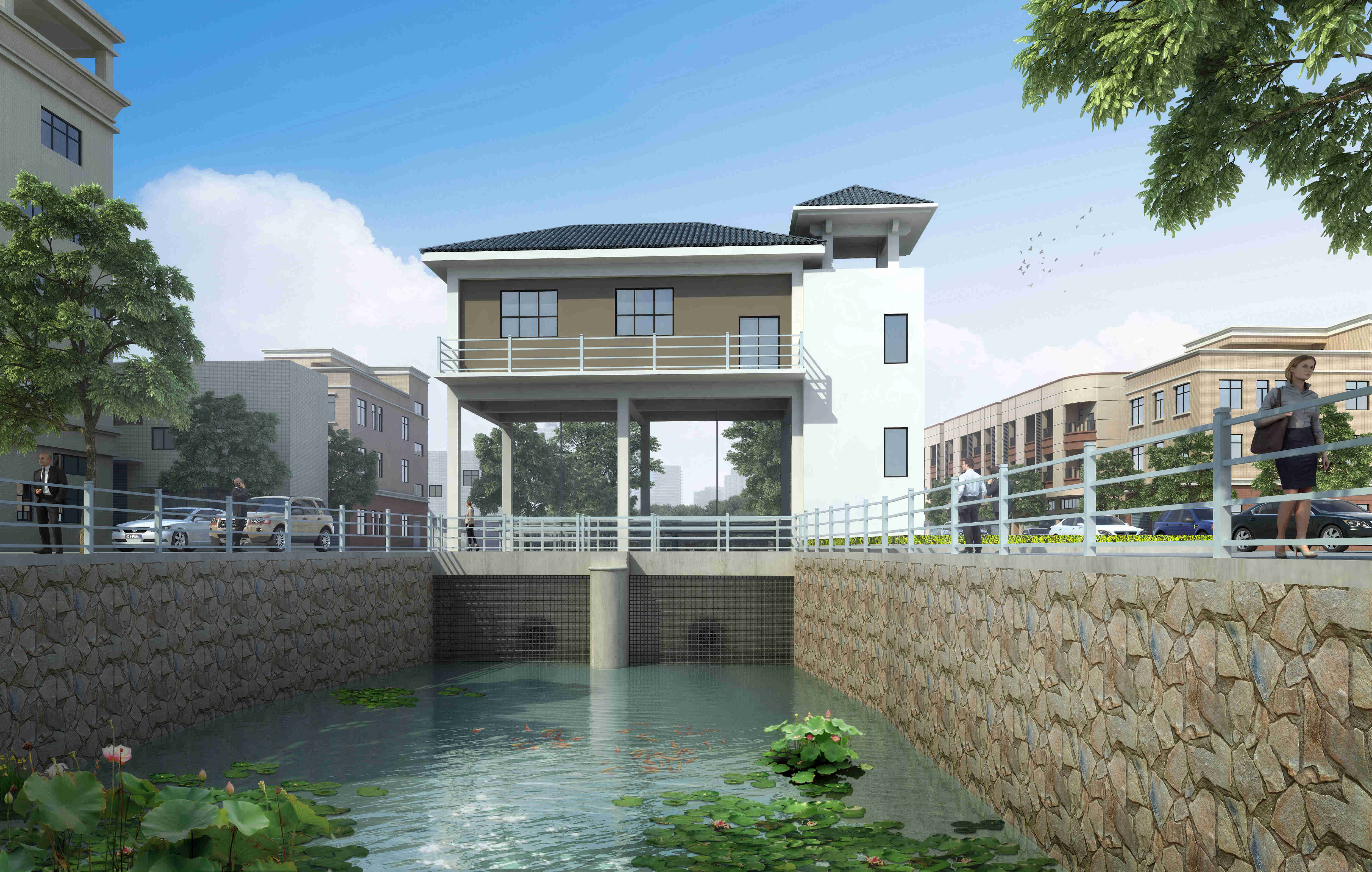# 泵站和闸站一体式设计,闸门既是挡水结构又是水泵支撑的基础。不建固定的泵室,水泵布置在闸门上的创新性引排功能建筑,相比传统闸站功效大大增强。