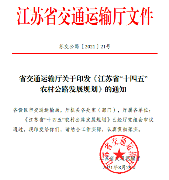 近日,集团承担编制的《江苏省“十四五”农村公路发展规划》(以下简称《规划》)正式印发。《规划》将为推动江苏农民农村共同富裕、率先基本实现农业农村现代化提供有力支撑,为全国农村交通服务乡村振兴战略提供江苏方案。