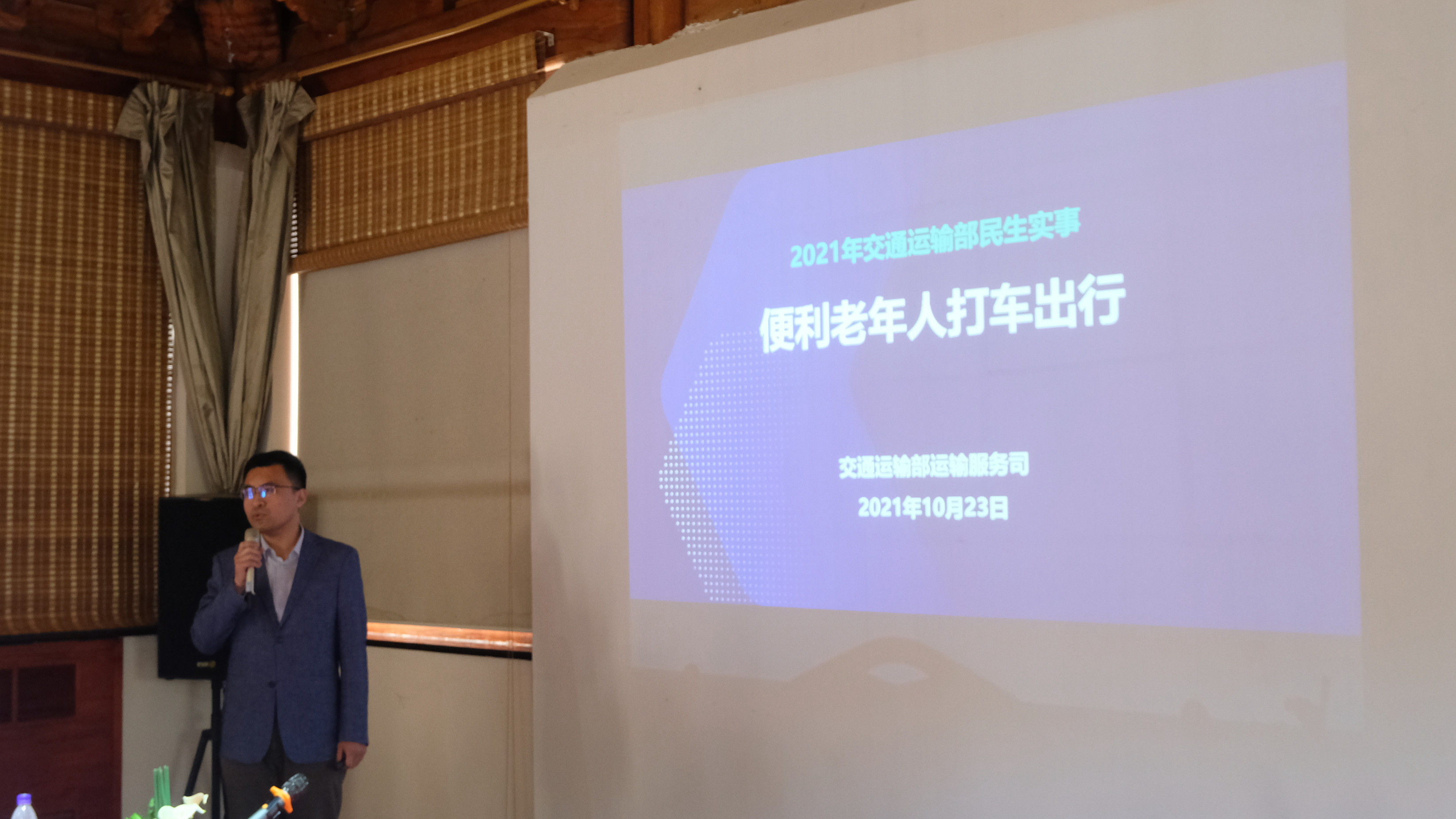 ▲ 交通运输部运输服务司城市交通管理处副处长马明介绍“便利老年人打车出行”民生实事进展情况
