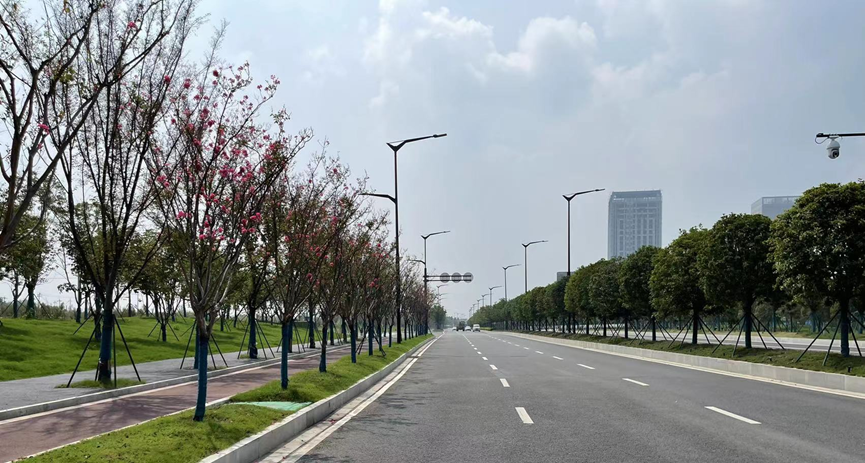 景观绿化紧扣“四季有绿、四季有花、四季有景”的思路,人行道、分隔带、路口岛头选用紫薇、染井吉野樱、四川国旗红、常夏石竹、香樟、丛生朴树、乌桕、垂丝海棠等,打造一路一特色的景观亮点。