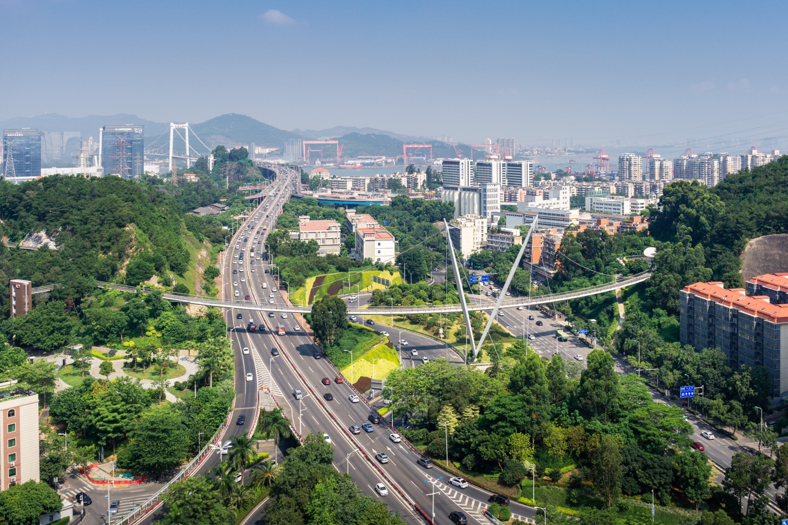 和美桥位于海沧大桥桥头,横跨仙岳路,首尾连接狐尾山、仙岳山,对厦门山海健康步道的东西向贯通起到极其重要的作用。从建筑语言上,和美桥将曲线梁与单塔悬索桥相结合,通过象征胜利的V型桥塔连同有序排列的索网、弯曲有度的桥面,如同双臂张开的怀抱,热情洋溢地拥抱着行人,欢迎远方的来客,充分展现厦门宾至如归的城市形象。桥梁周边的无障碍便民设施实现了行人与城市繁忙交通的分离,提供了畅行赏景的便利,让人与自然和谐共存,成为鹭岛西门户引人注目的地标建筑。