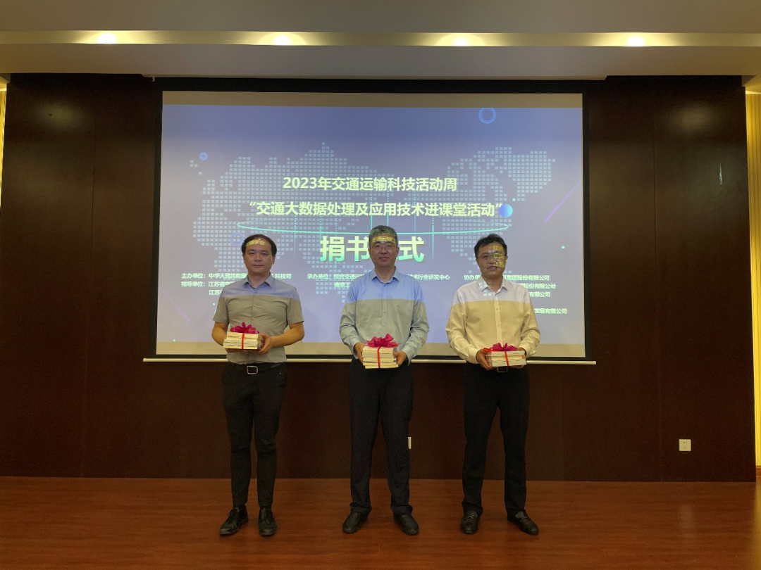 为了积极响应交通科普知识的主题,倡导校园“全民阅读”,活动组织了捐书仪式,由大数据研发中心向南京工业大学交通运输工程学院捐赠交通大数据系列书籍。现场仪式由江苏省交通运输厅科技处副处长范晓锋、fun88智慧交通研究所所长张日民作为大数据研发中心代表,南京工业大学交通运输工程学院院长周峰作为学院代表。希望借助交通大数据书籍的主题式阅读,帮助学生开启一场交通知识的探索之旅。