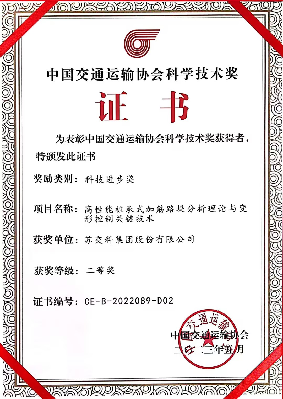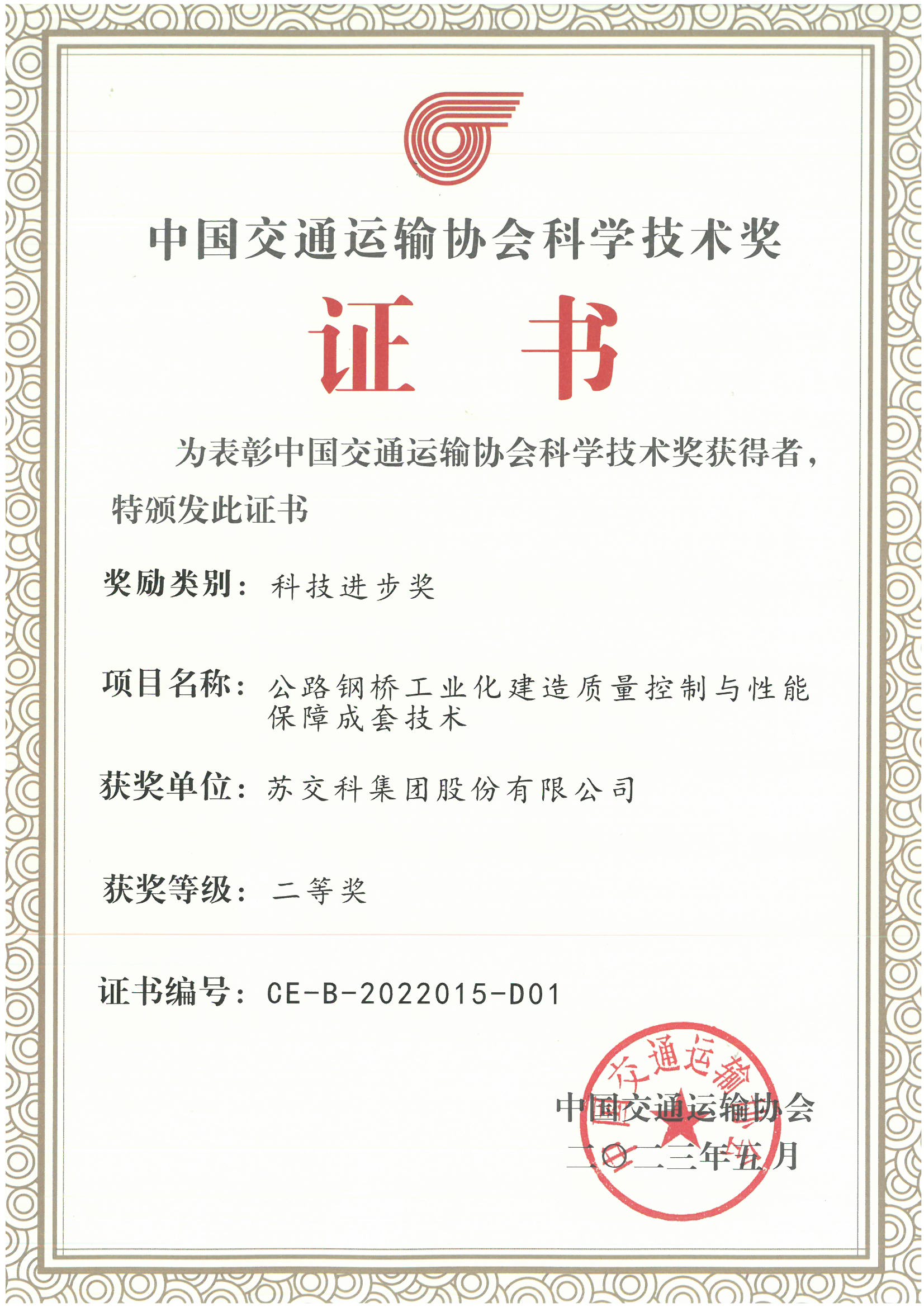 近日,2022年度中国交通运输协会科学技术奖名单正式公布。集团完成的两项科研成果“公路钢桥工业化建造质量控制与性能保障成套技术”、“高性能桩承式加筋路堤分析理论与变形控制关键技术”均荣获2022年度中国交通运输协会科学技术二等奖。