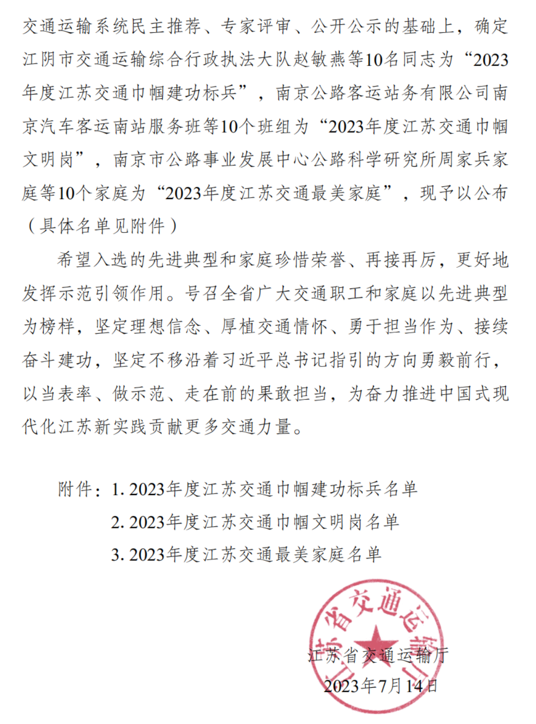 近日,江苏省交通运输厅发布“2023年度江苏交通巾帼建功先进典型和江苏交通最美家庭”的获奖名单,