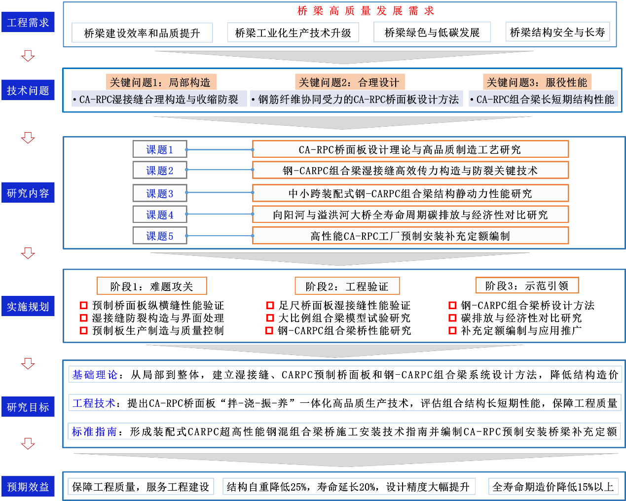 本课题依托集团承担勘察设计的南京至滁州高速公路江苏段向阳河特大桥和唐娄水库溢洪河大桥项目,以推动桥梁全寿命周期性能提升和实现桥梁低碳长寿发展为核心,开展钢-CARPC 组合梁设计理论及施工关键技术、中小跨装配式钢-CARPC组合梁结构静动力性能、CA-RPC桥面板制造工艺、钢-CARPC 组合梁湿接缝高效传力构造、高性能 CA-RPC工厂预制安装补充预算定额编制和全寿命周期碳排放计算等研究工作,为实际工程应用和技术推广提供基础。