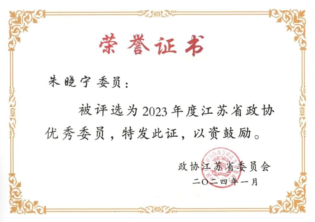 朱晓宁委员始终坚持为国履职、为民尽责的情怀,坚持双向发力,认真履行职责,充分发挥了在本职工作中的带头作用、在政协工作中的主体作用、在界别群众中的代表作用,展现了新时代新征程委员风采,政协江苏省委员会授予其“2023年度省政协优秀委员”荣誉称号。