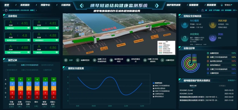 构建建养一体智慧化平台---方案设计阶段针对施工面临诸多难题,提出防火板覆盖条件下环缝测缝计定位、运营盾构隧道弧形顶面综合布线等方法,提高项目实施效率,降低了项目建设风险且保障了项目实施质量。项目实施过程中考虑了单一指标预警和多指标综合预警两种模式实现结构安全的自动化感知,建立了模糊综合层次分析法为基础的整体安全管控体系,并采用3D建模软件精细化建模,构建了实时监测+预警+分析评估+养护决策+系统管理的软件平台。