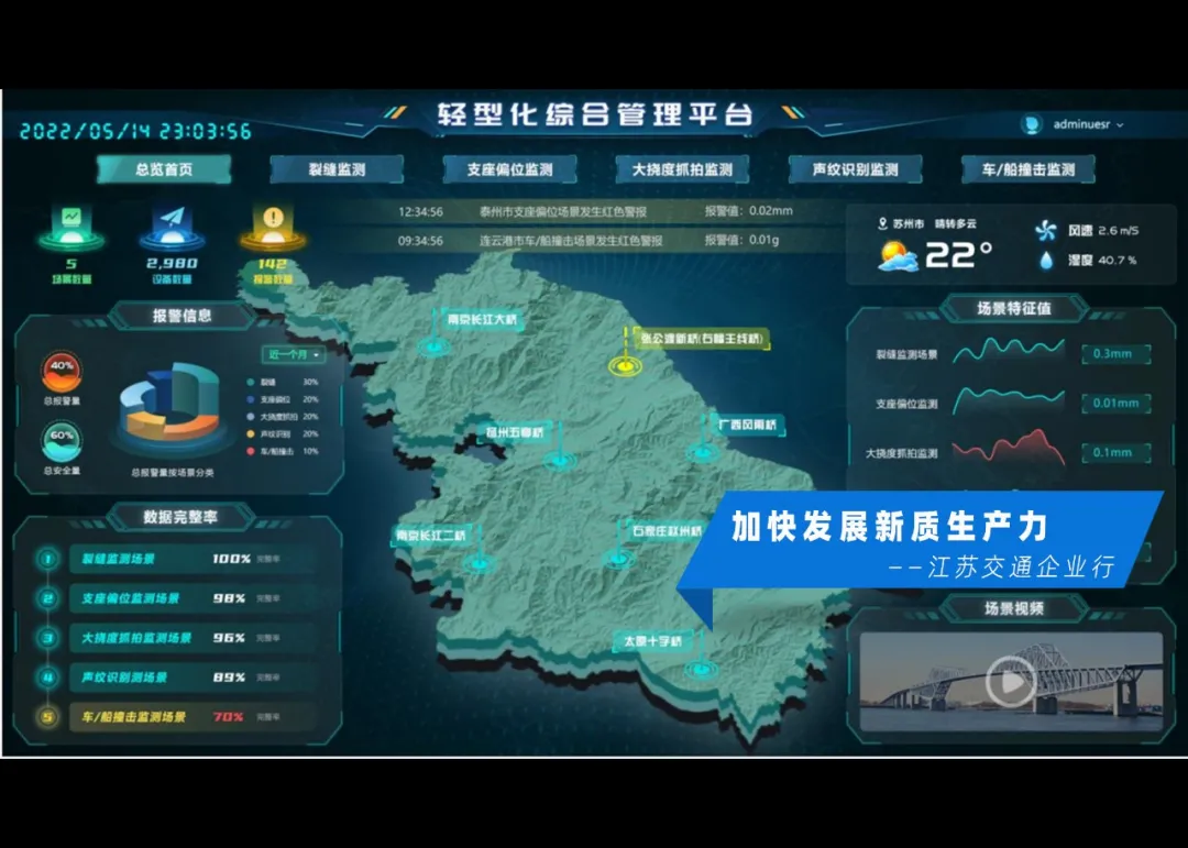 2022年,在省交通运输厅的组织下,厅公路事业发展中心和fun88集团联合开展江苏省干线公路重点桥梁轻量化监测技术研究,并于同年9月印发《江苏省普通国省道桥梁轻量化监测系统建设指南》,建立全国首个桥梁轻量化监测标准体系,为行业发展贡献智慧。