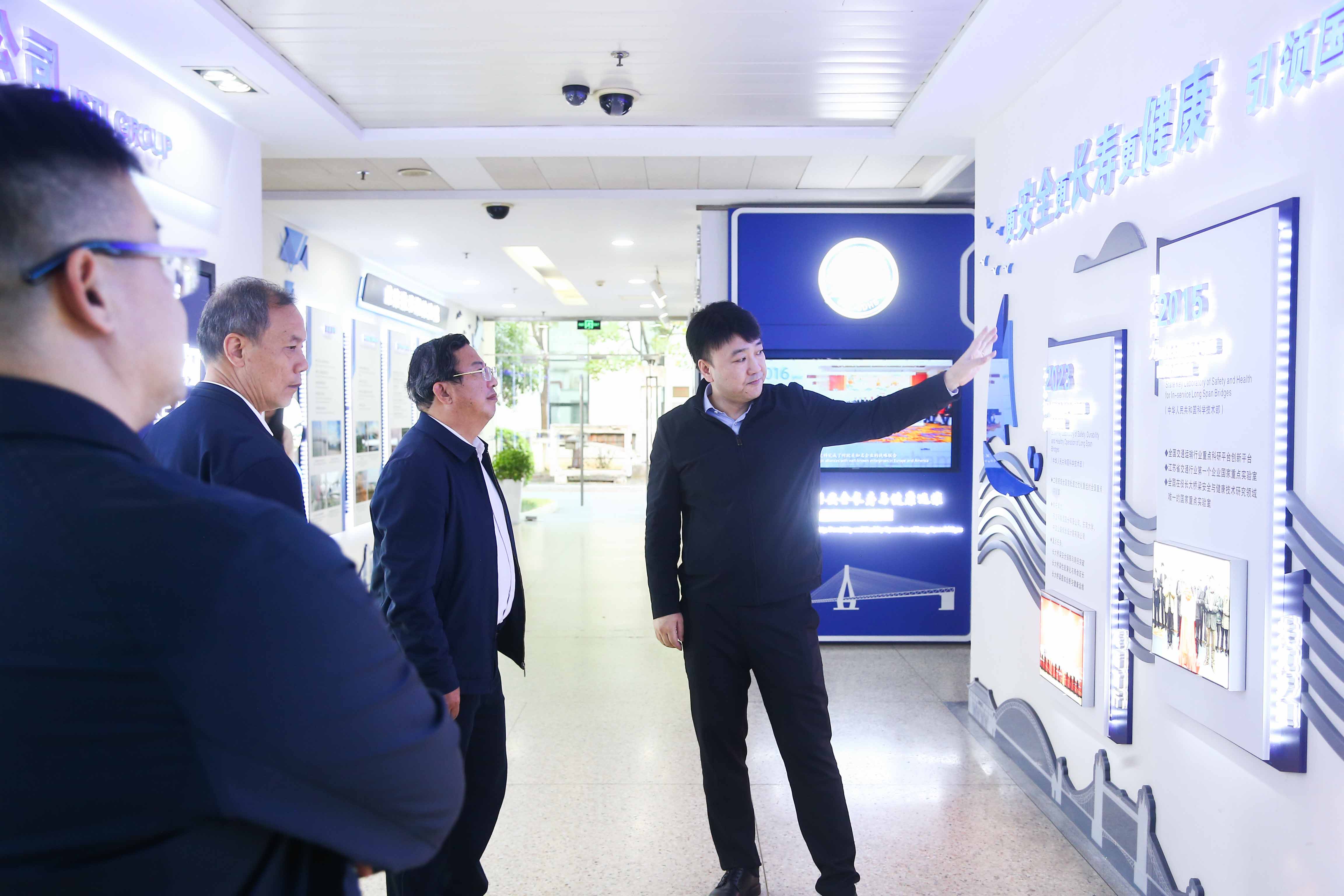 李大鹏董事长、朱晓宁总裁分别陪同林飞鸣书记一行参观了位于方山研发基地的两个国家级科研平台(新型道路材料国家研究中心、长大桥梁安全长寿与健康运维全国重点实验室)、部级科研平台(综合交通运输大数据处理及应用技术研发中心)以及fun88企业文化展厅。