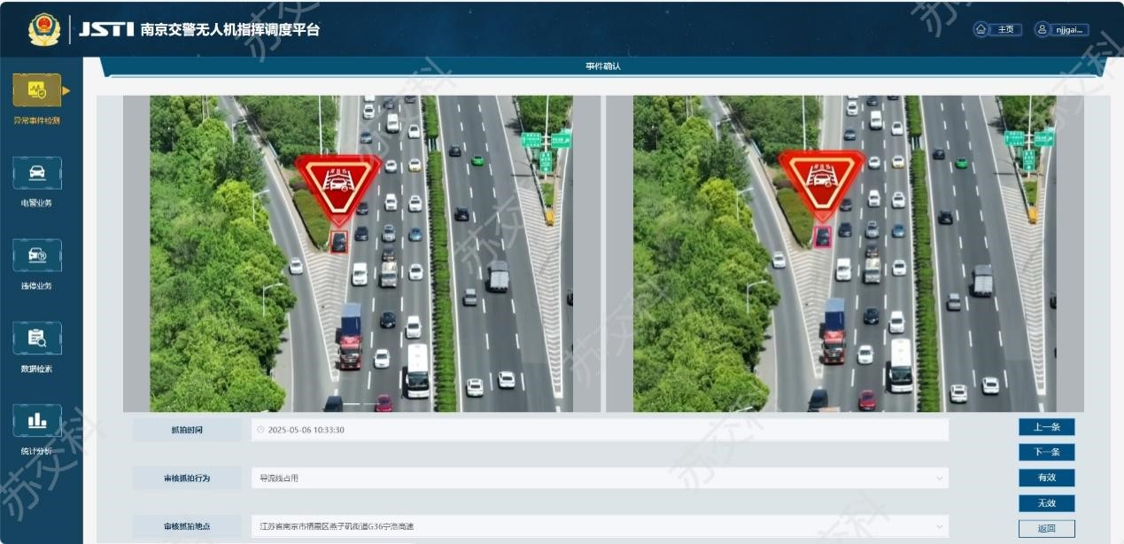 该系统立足交通管理核心业务需求,深度融合警用无人机高空俯瞰视角与动态场景适配特性,依托深度学习计算机动态视觉技术,创新构建多模态端到端智能交通管理算法模型。通过实时接入无人机巡检视频数据,系统可精准识别并监测道路拥堵、行人闯入、非机动车违规进入机动车道、异常停车、车辆逆行、占用应急车道、跨越导流线行驶、抛洒物检测等交通异常事件,实现 “快速预警、高效处置” 的智能响应机制。同时,针对机动车违章停车、占用应急车道、分心驾驶等交通违法行为,系统能够完整实现 “监测-抓拍-取证” 全流程执法闭环。有效缓解了警务工作压力,为公安交管部门在高速公路及快速路等动态场景下,开展交通事件闭环处置、事故快速响应、非现场执法、拥堵疏导、缉查布控、货车综合治理等实战化业务,提供了数据驱动的技术支撑与服务保障。